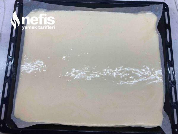 6. Karışımı yağlı kağıt serdiğimiz fırın tepsisine dökelim her yerine eşit biçimde yayalım.