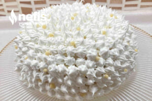 13. Dinlenen pastanın üzerini kalan krema ile kaplayalım. En son pastanın her yerini hazırladığımız kremşantiyle aparat yardımı ile süsleyerek kapatalım.