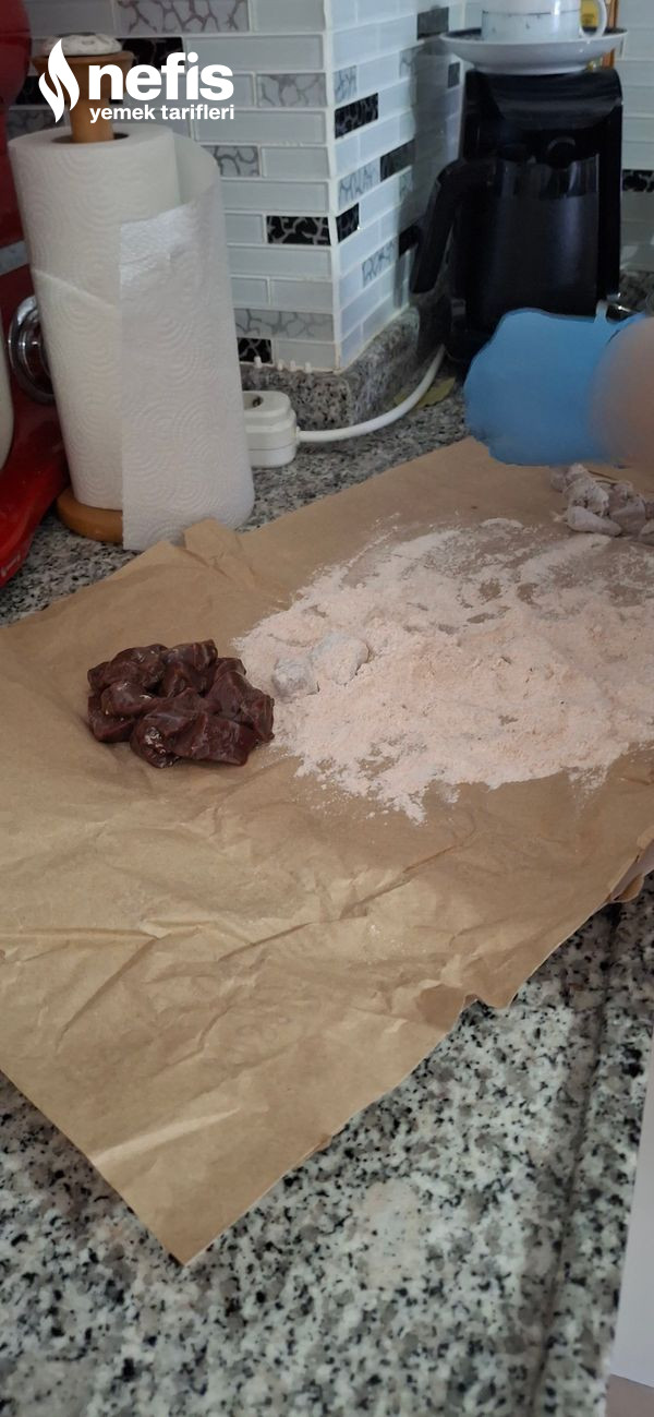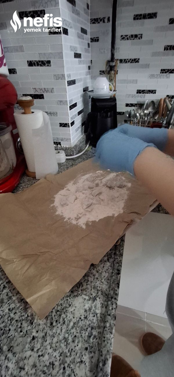 - Temiz bir kağıdın üzerine bir ölçü un ve toz biberi alıp karıştırıyoruz.