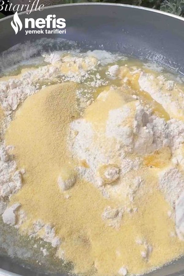 - Genişçe bir tavaya aldığımız sıvı yağı ve tereyağını ısıtttıktan sonra içine un ve irmiği ek edip yeterlice renk alana kadar orta ateşte kavuralım.