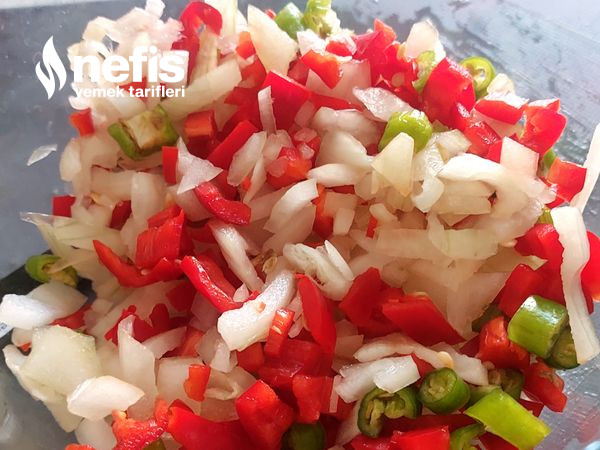 3. Soğanı, yeşil ve kırmızı biberlere ince ince yemeklik kıyalım. ( görseldeki gibi).