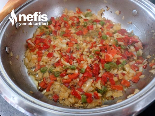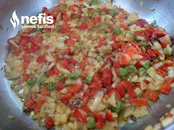 5. Uygun bir tavaya zeytinyağı ve tereyağını alalım ve kızgın yağın üzerine ince ince kıyılmış soğanı, ve biberleri alalım, damak tadınıza nazaran tuzu ekleyelim yumuşayana kadar kavuralım.