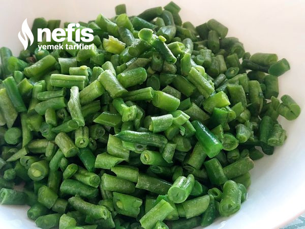 2. Taze fasülyeleri yıkayalım ve uçlarını kesip 1 santim kalınlığında kıyalım ( görseldeki gibi).