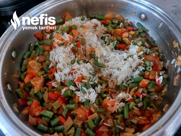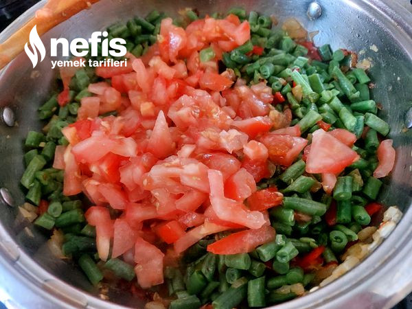 6. Yumuşamış olan sebzelerin üzerine fasülye ve domatesi ek edelim damak tadınıza nazaran tuzu ve baharatı ek edelim ve kaşık yardımı ile iki üç karıştıralım kapağını kapatarak kısık ateşte domatesler yumuşayana kadar pişmeye bırakalım.