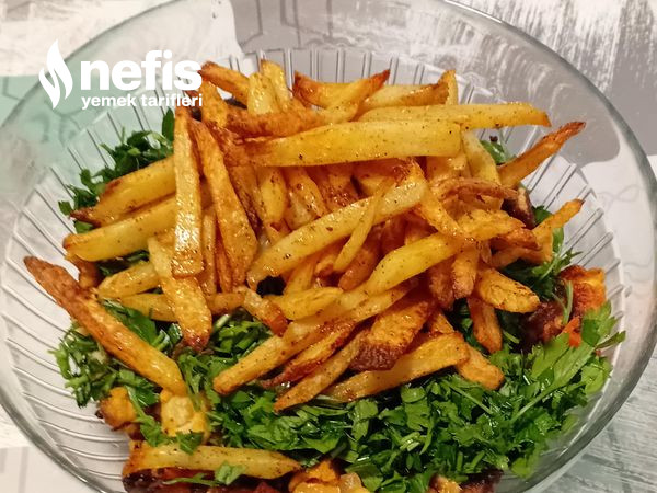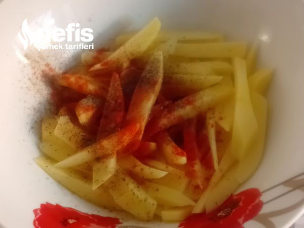 - Patatesi ince parmak formunda kıyalım, üzerine karabiber ,pul biber, tuzu, sıvı yağ ek edelim.