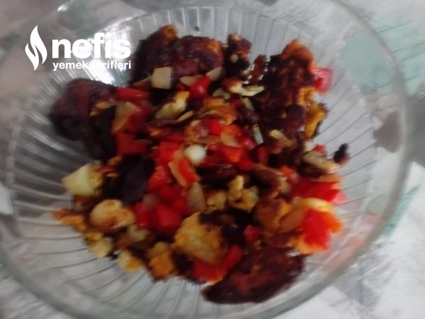 - Diğer taraftan uygun tavaya yağı ek edelim kızgın yağın üzerine küp küp kıyılmış soğanı ve ince ince kıyılmış kapya biberi ek edelim hafız yumuşayınca servis tabağına alalım.