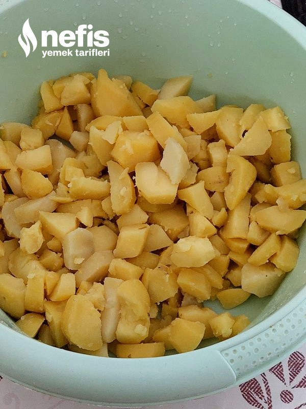 - Öncelikle patatesleri kabuklarıyla haşlayalım. Haşlanmış olan patatesin kabuğunu soyup, ince ince kıyalım.