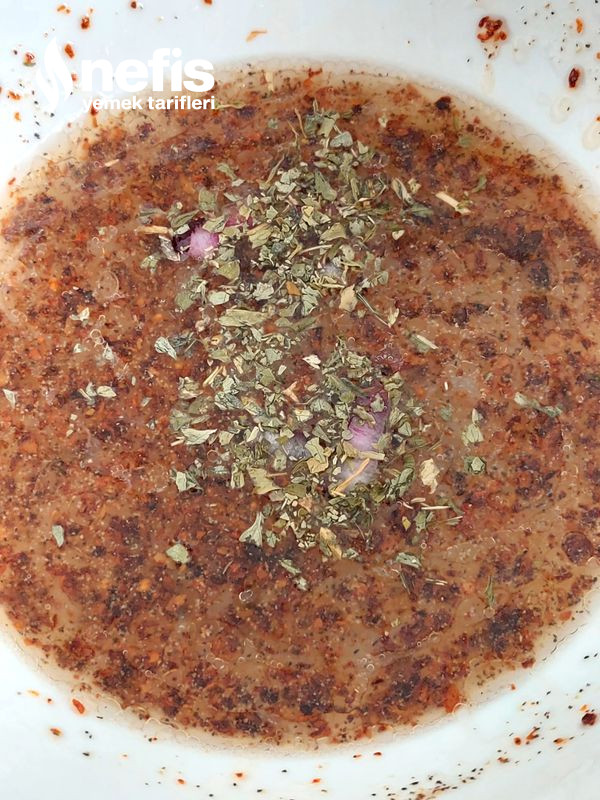 - Sosun hazırlığına geçelim. Limon suyunu sıkalım üzerine yağı ek edelim, karabiberi pul biberi damak tadınıza nazaran ek edelim.