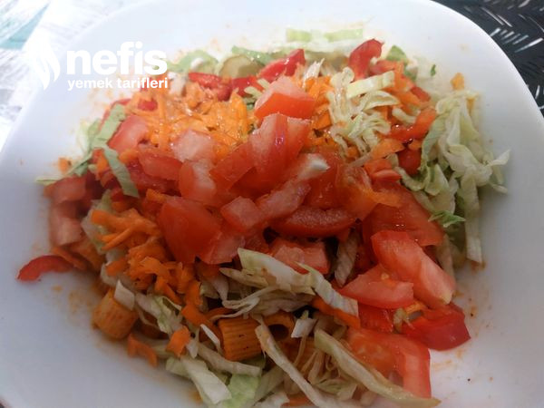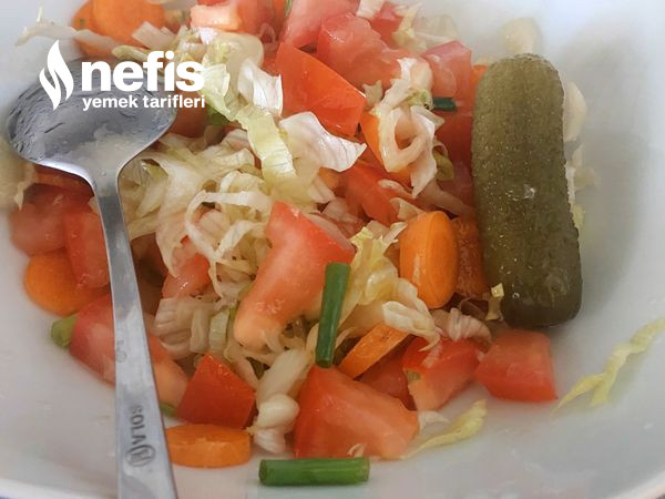 6. Salataya gecelim. İsberg marul ince ince kıyalım. Domatesi ince ince küp küp kıyalım. Taze soğanı ince ince kıyalım. Kornişon turşusunu ince ince kıyalım. Kekigi ilave edelim. Havucu rendeleyelim. Kırmızı bıberı ınce ınce kıyalım. Zeytinyağı salatanın üzerine gezdirelim.
