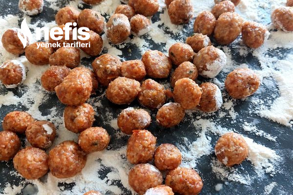 - Elimizi ıslatarak misket büyüklüğünde köfteler yuvarlayalım. Köfteleri una bulayalım.