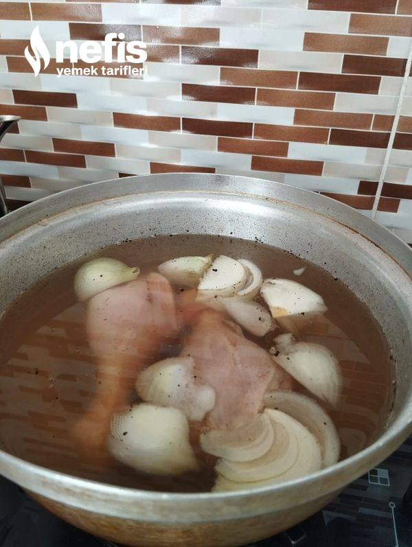 - 4-5 su bardağı tavuk suyu ( haslanan tavuk budu suyu )
