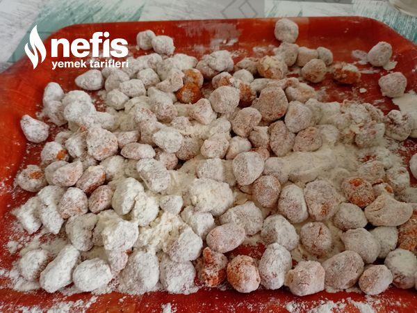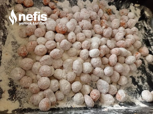 - Hamurdan küçük kesimler koparılarak yuvarlayalım. Yaptığımız topalakları unlanmış bir tepsiye ek edelim. (görseldeki üzere ).