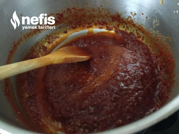 - Uygun bir tavaya tereyağını ve sıvı yağı alalım kızgın yağın üzerine salçayı ek edelim kokusu çıkana kadar kavuralım.