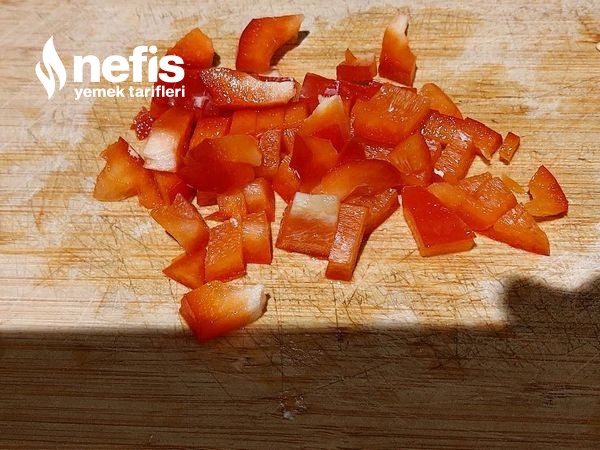 4. Kırmızı biberi ince ince kıyalım, ve yumuşayana kadar kısık ateşte kavurmaya devam edelim.