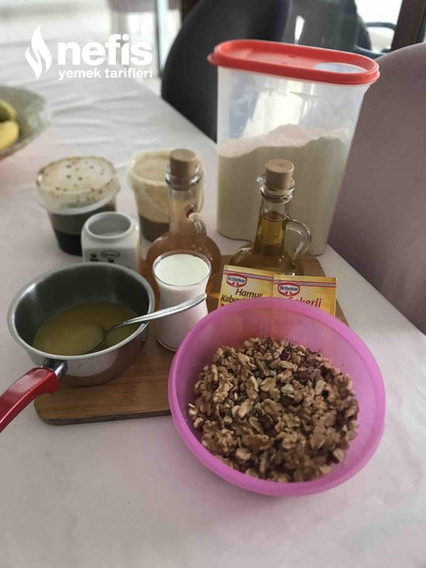 2. Hamuru için, bir kaba un, ceviz, kabartma tozu hariç tüm gereçler konur ve karıştırılır.