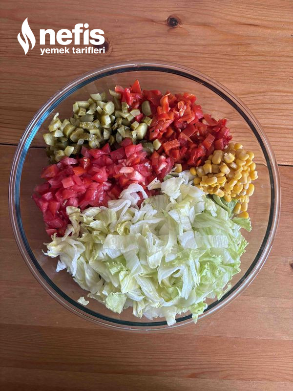 - Közlenmiş kırmızı biber, göbek, kornişon turşu, domates ve mısırları bir kaba koyun.