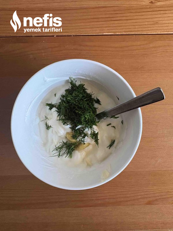 - Üzerine bir tatlı kaşığı hardal bir tatlı kaşığı mayonez koyun dereotunuda küçük küçük keserek üzerine ekleyin.