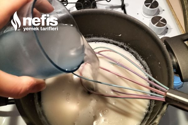 - Buğday nişastasını ek ediyoruz. Durmadan karıştırıyoruz.