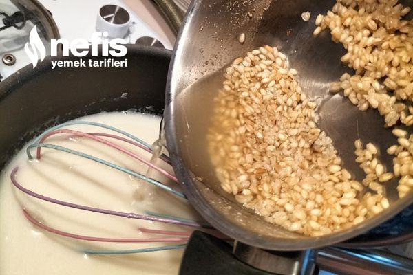 - Unun rengi hafif sararıp göz göz kabarcık çıkardığında 1 bardak soğuk ya da sıcak farketmez bitkisel sütümüzü yavaş yavaş tencereye döküyoruz o sırada çırpıcı tel yardımıyla karıştırmaya devam ediyoruz.