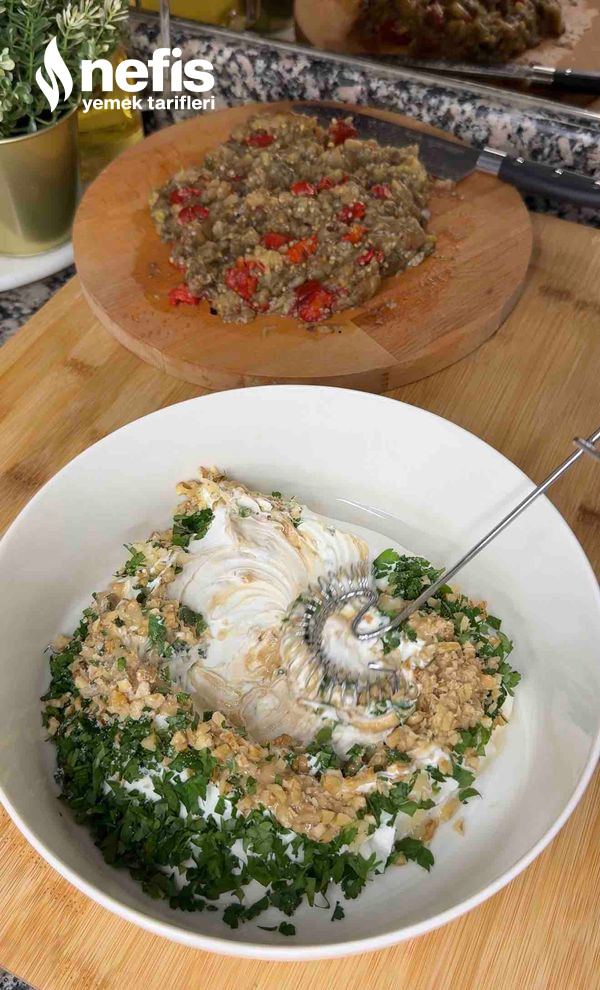 - Salatayı yapacağımız kaba yoğurdu,tahini,ceviz ve maydanozu,sarımsağı,limon suyu ve tuzunu atıp karıştıralım.