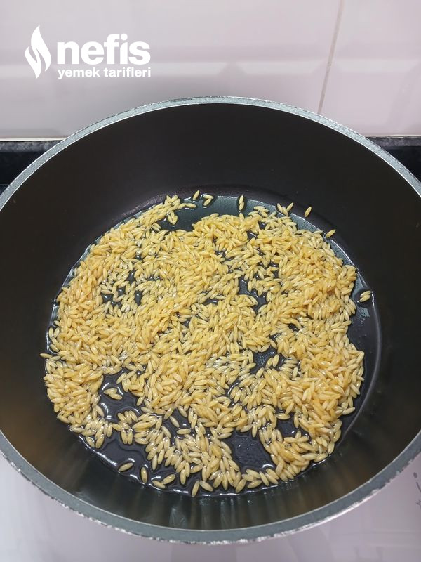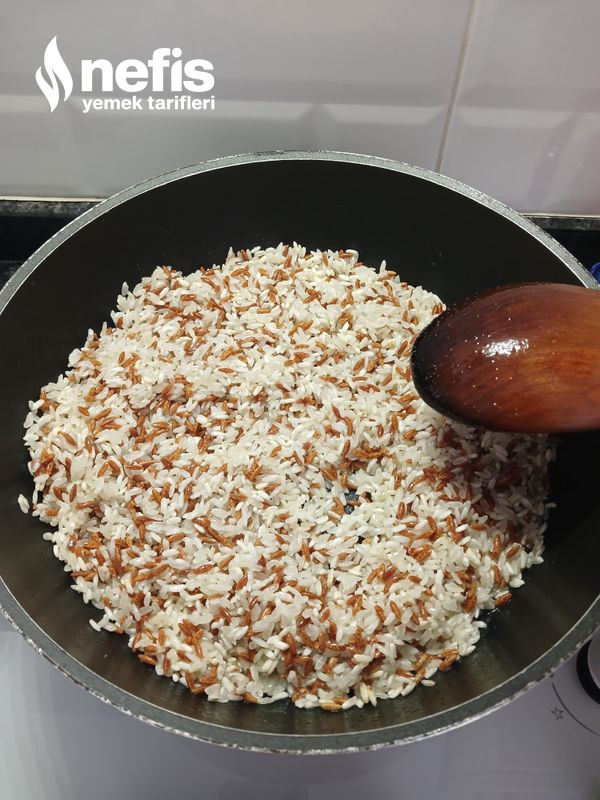 - Şehriyeler kızarınca yıkadığımız pirinçi tencereye alalım ve 5 dakika karıştırarak kavuralım.