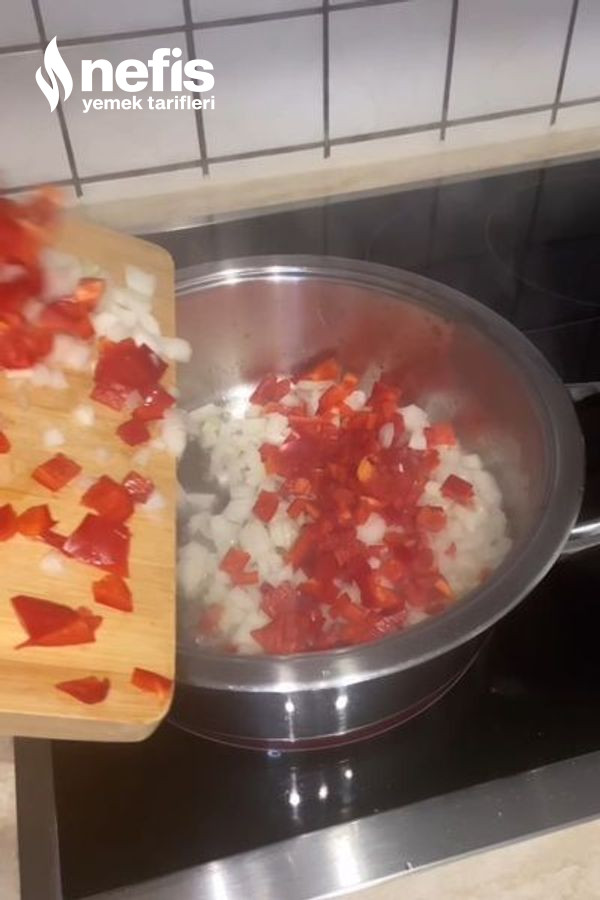 - Soğanı, kırmızı biberleri küp küp doğrayıp zeytinyağında kavurun.