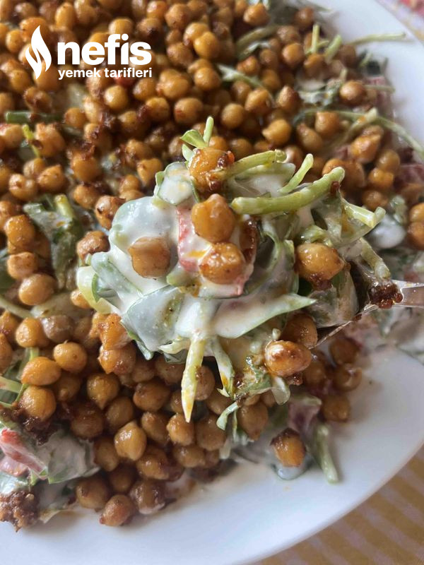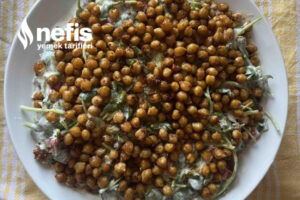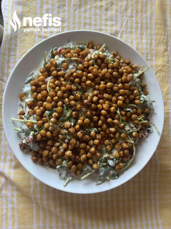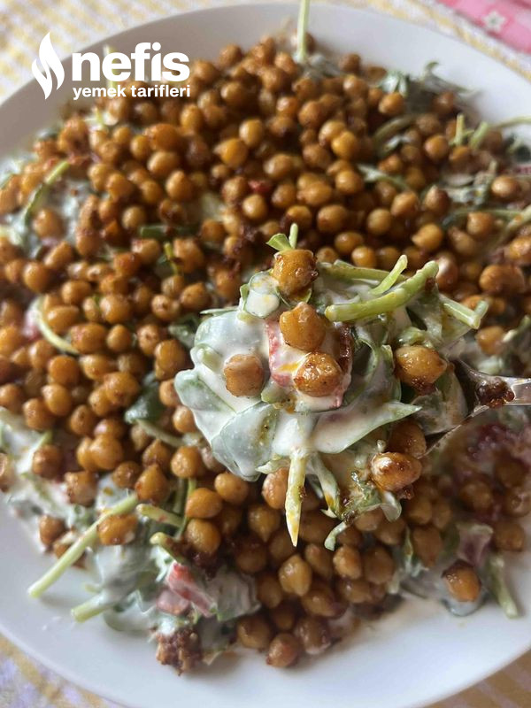 - Servis tabağına aldığımız yoğurtlu semizotunun üzerine kızarttığımız nohutları yağıyla birlikte dökelim.