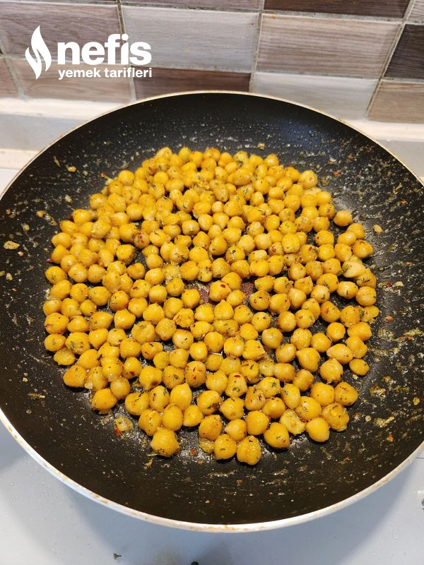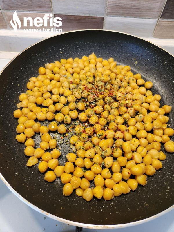 - Zeytinyağı ile yağladığımız tavada nohutlar biraz kızarana kavrulur. Pul biber ve nane eklenir.