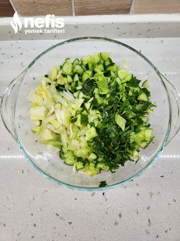 - Salatalık küçük küçük doğranır. Maydanoz da ince ince doğranır.