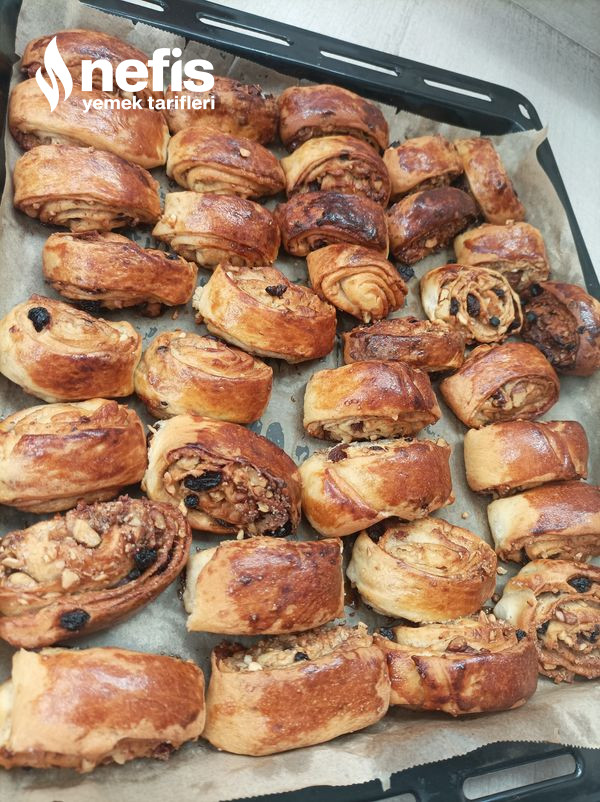 - Karıştırma kabında ceviz fındık tarçın şeker üzüm karıştırılır iç harcı hazır edilir. Hamur mayalandıktan sonra 8 bezeye ayrılır.