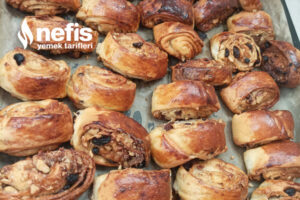 - Karıştırma kabında ceviz fındık tarçın şeker üzüm karıştırılır iç harcı hazır edilir. Hamur mayalandıktan sonra 8 bezeye ayrılır.