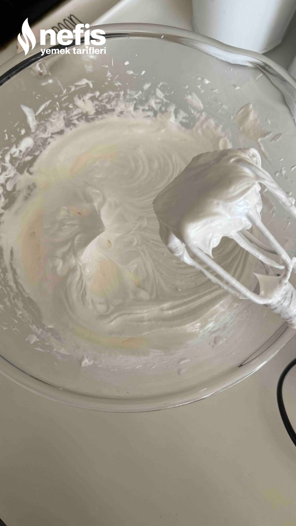 8. Mereng parlak ve ağır bir kıvama geldiğinde kabı zıt çevirin uçta sert, dik ve bir zirve oluşuyorsa hazır demektir.