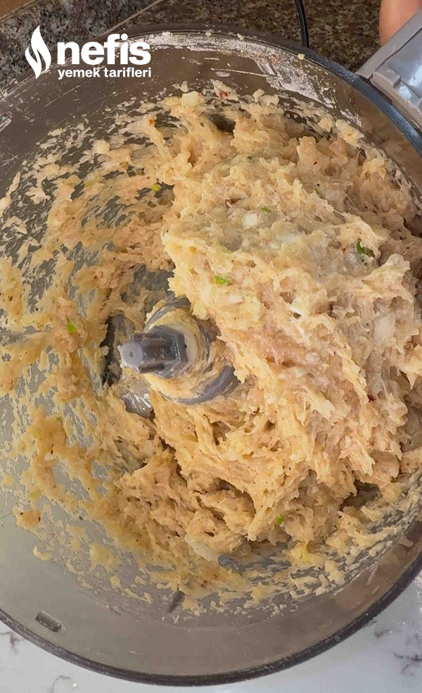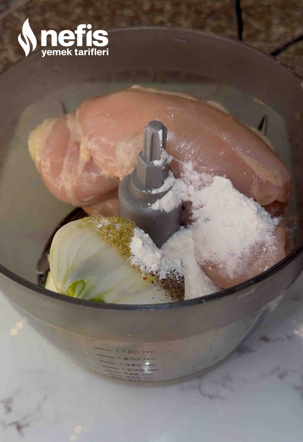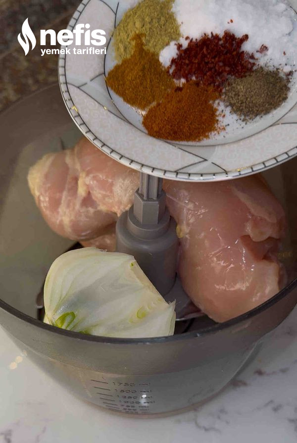 - Tavuk göğsünü mutfak robota koyun soğan sarımsak un tuz baharatları koyup macun halinde gelene kadar karıştırın.