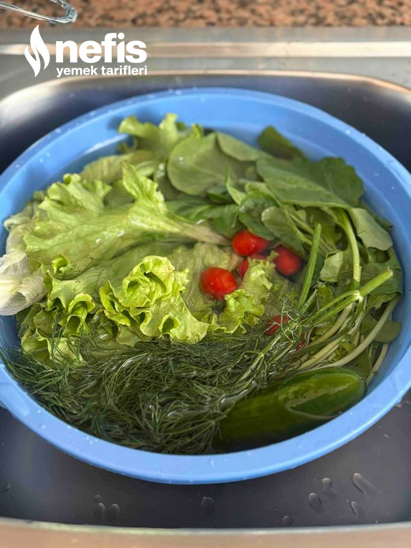- Yeşillikler hariç tüm gereçleri yeniden derince bir kaba ekliyoruz.