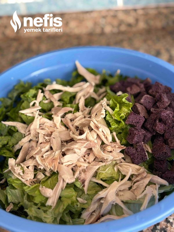 - Yeşillikleri de doğrayıp, didiklediğimiz tavukları ve kıtır ekmekleri( ben yaptığım mor ekmeği kullandım) ekliyoruz.