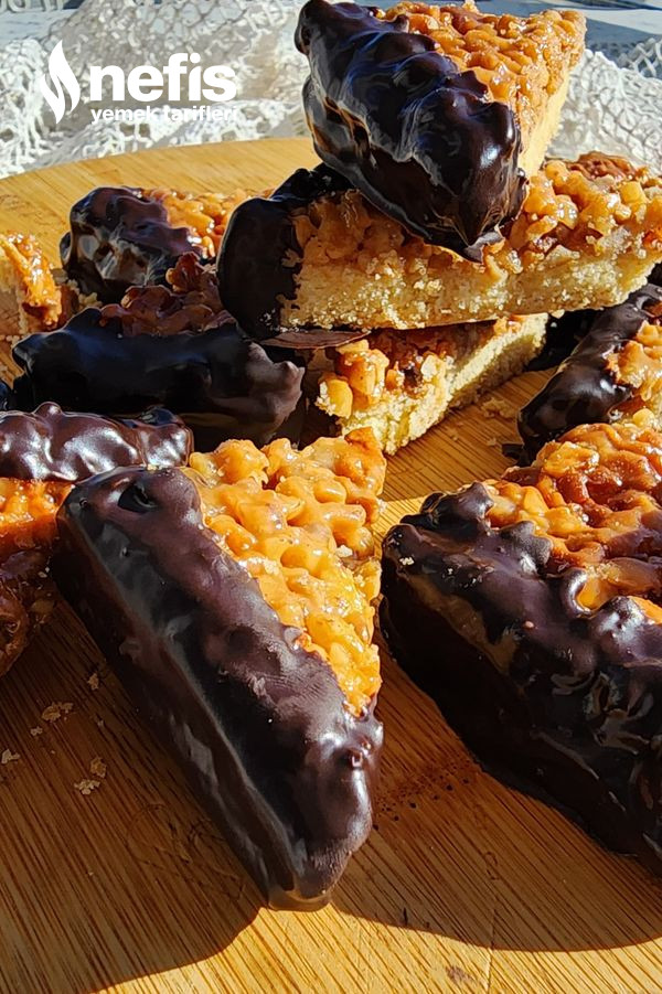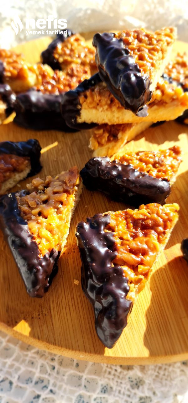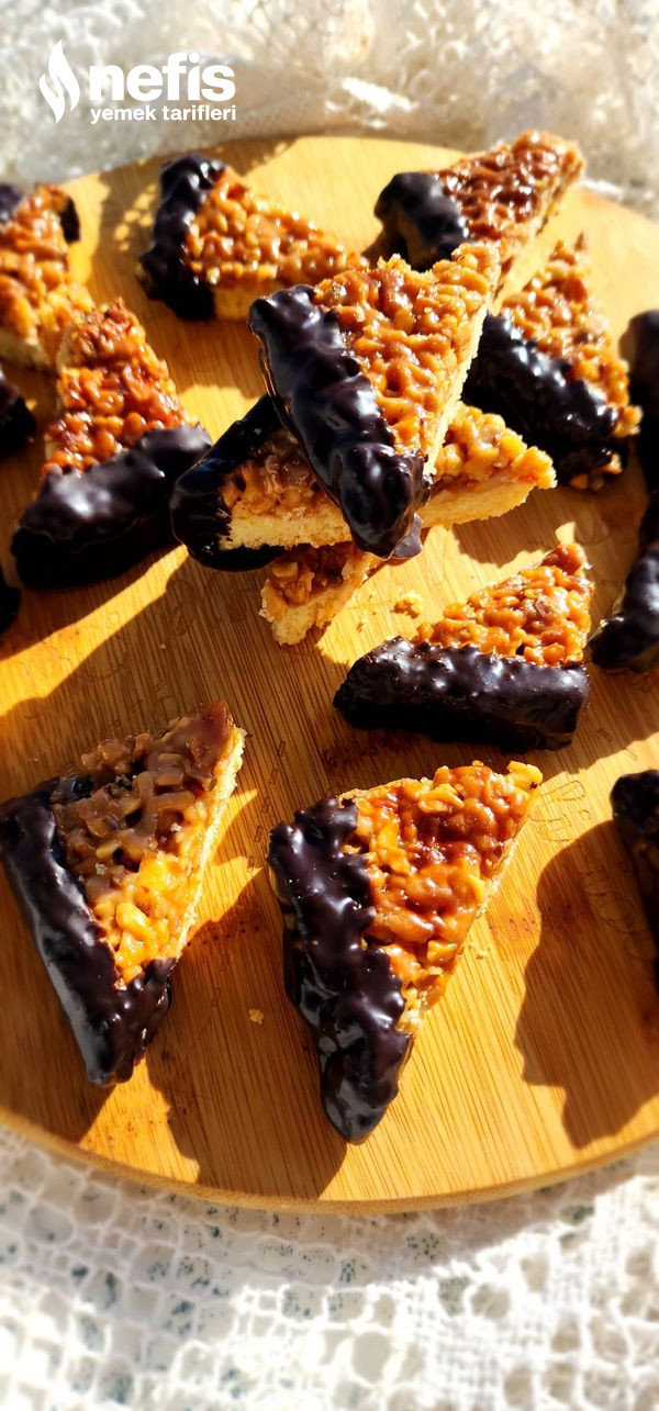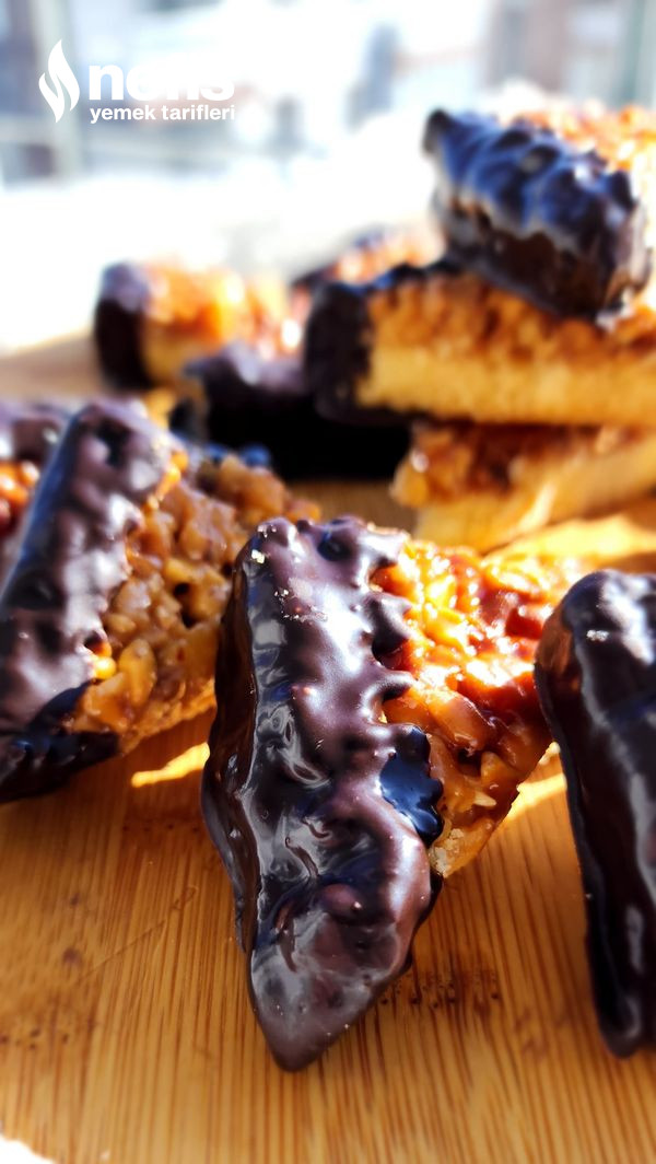 9. Soğuyan kurabiyeleri benmari yolu erittiğiniz çikolataya köşelerini batırıp servis edelim.