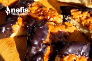 9. Soğuyan kurabiyeleri benmari yolu erittiğiniz çikolataya köşelerini batırıp servis edelim.