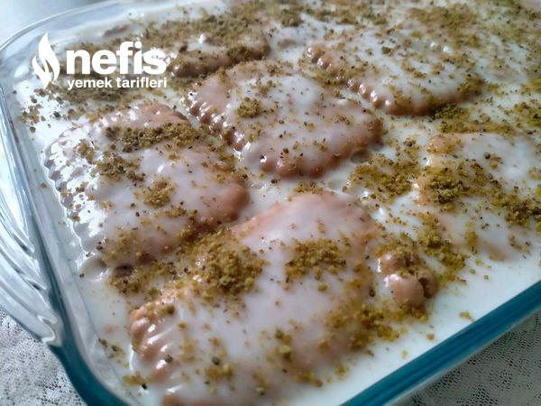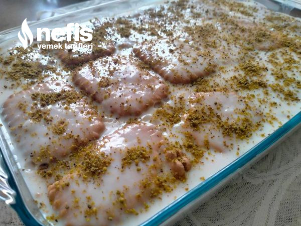 4. Diğer bir buçuk paket ile üzerlerini kapatalım,kare yada dikdörtgen borcama dizelim ,antep fıstıklı pudingi üzerine kepçeyle ıslanana kadar gezdirelim.