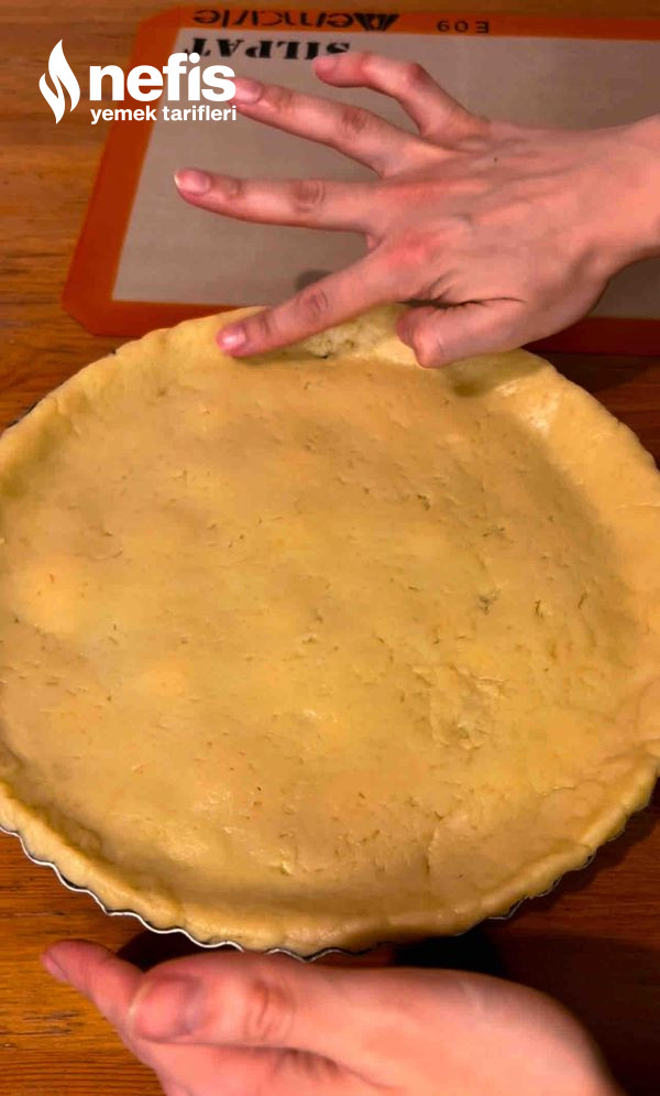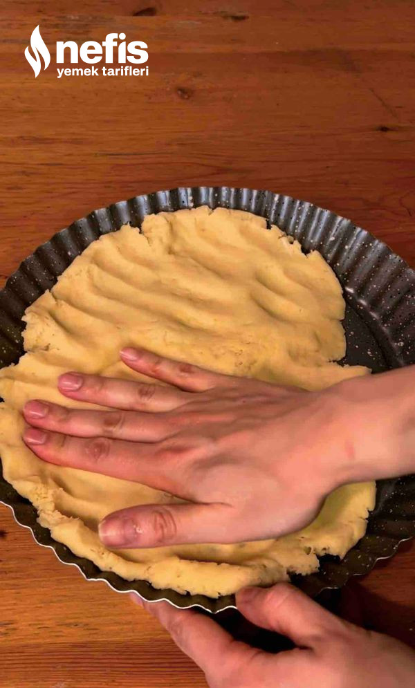 5. Hamuru 2 kesime bölüp bir modülünü turta kalıbına elimizle yayalım.
