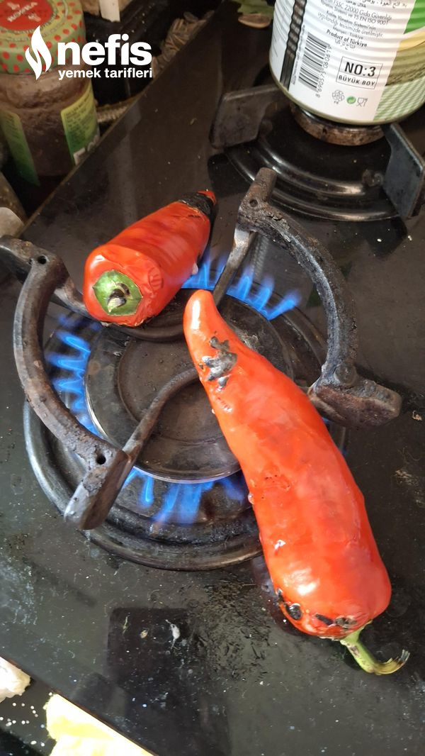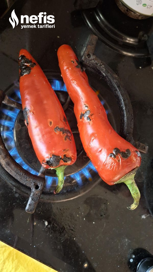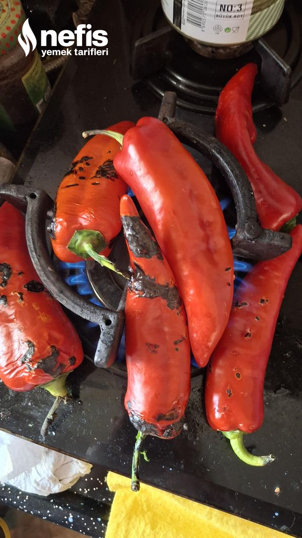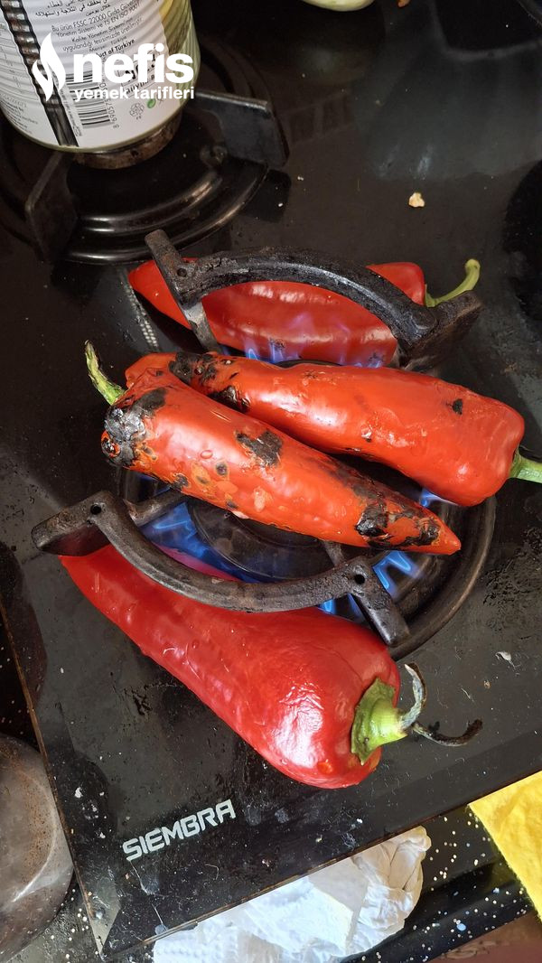 - biberleri maşa ile çevirerek her tarafını közlüyoruz. Kabukları siyahlaşıp baloncuk baloncuk olmalı. Bazen yanar üzere kokabiliyor fakat bu olağan.