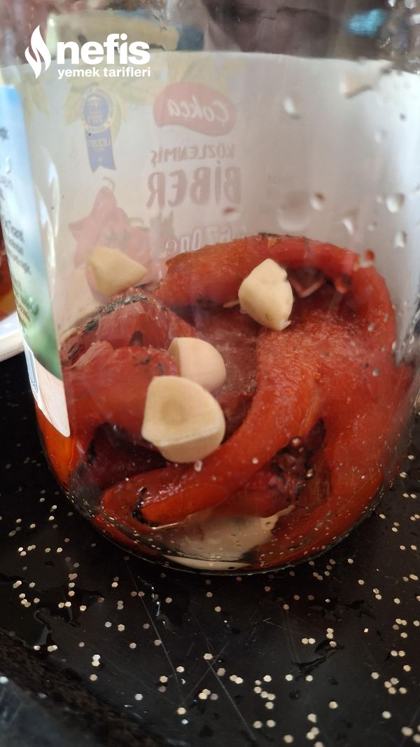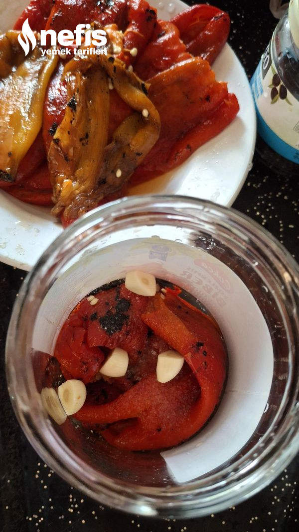 - Közlenen biberleri zeytinyağında saklama kademesi: biberleri közle, kabuklarını ve çekirdeklerini temizle. Şeritler halinde doğra (istersen bütün de bırakabilirsin)