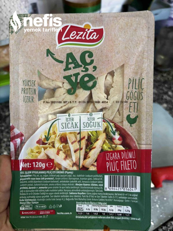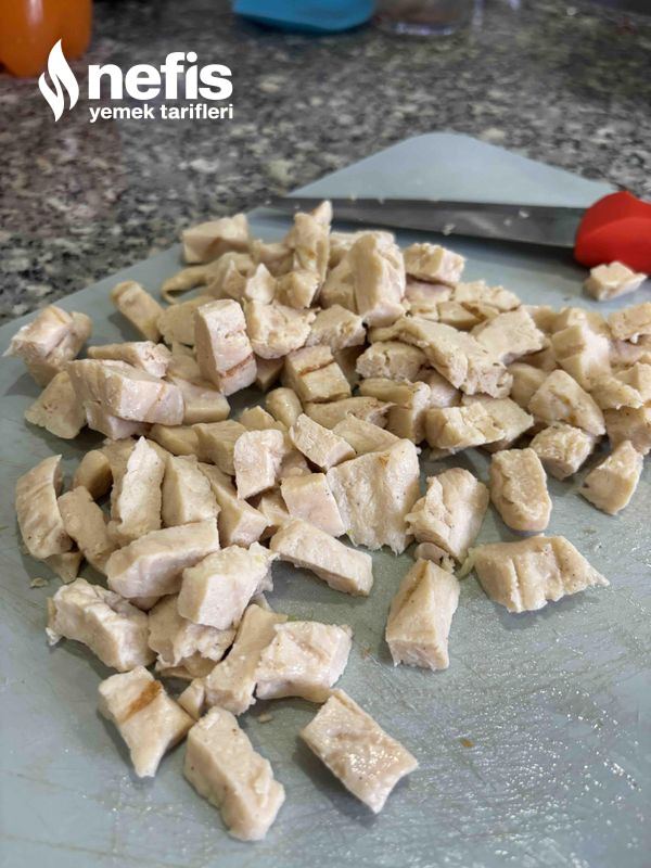 - Elinizde varsa haşlanmış ya da yağda soslu kızartılmış tavuk göğsü kullanabilirsiniz. Bende yoktu.