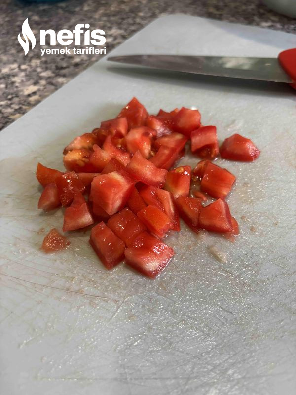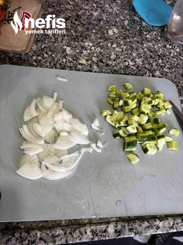 - Marulları minik minik, domatesleri küp küp, salatalıkları da cacıktan biraz daha büyük olacak formda kesiyoruz.