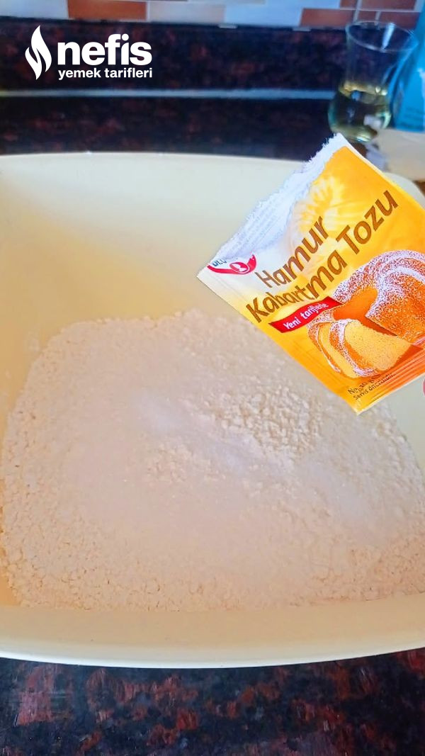 1. Bir yoğurma kabına;Un, tuz, şeker, kabartma tozu ekleyip elimizle karıştıralım daha sonra unumuzun ortasına çukur olacak biçimde açalım.
