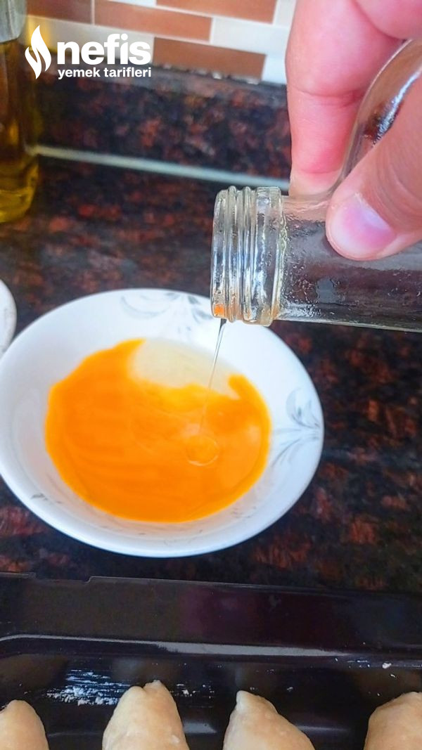 4. Poğaçalarımız hepsi bittikten sonra;Bir tabakta yumurta sarısını ve sıvı yağını ekleyip karıştıralım poğaçalarımızın üzerine fırça yardımı ile hepsine sürelim .