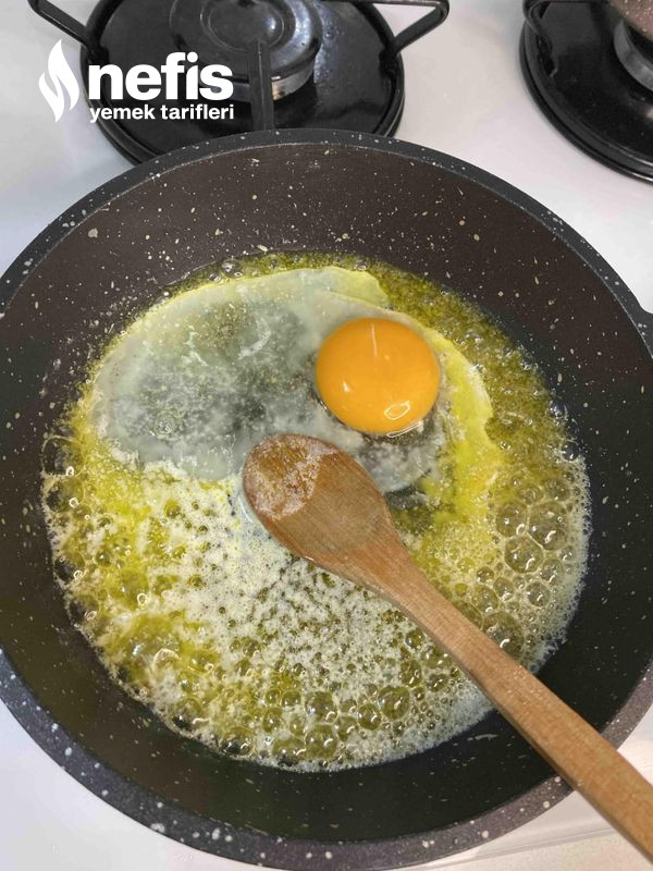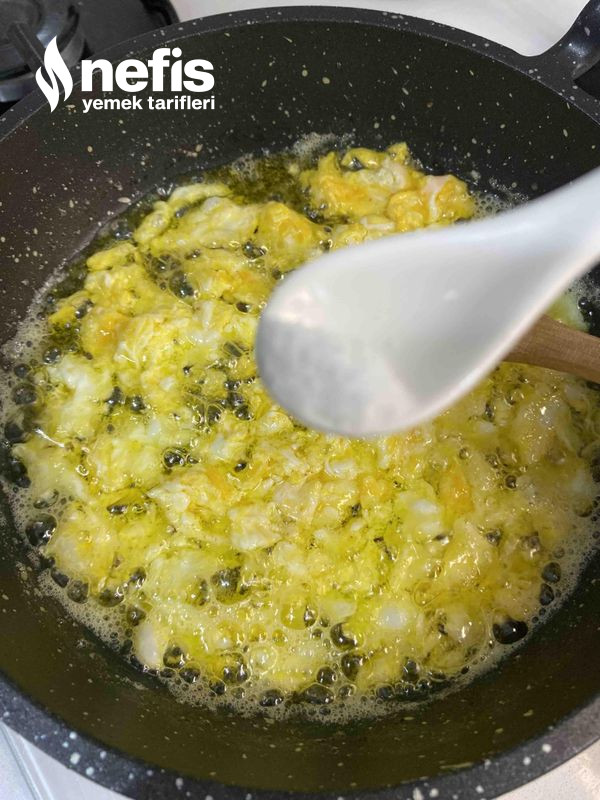 - Tereyağ kavrulmaya başlayınca yumurtaları kıralım ve karıştırarak yumurta parçalarınızda küçük olması sağlayalım.