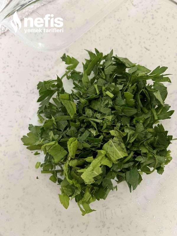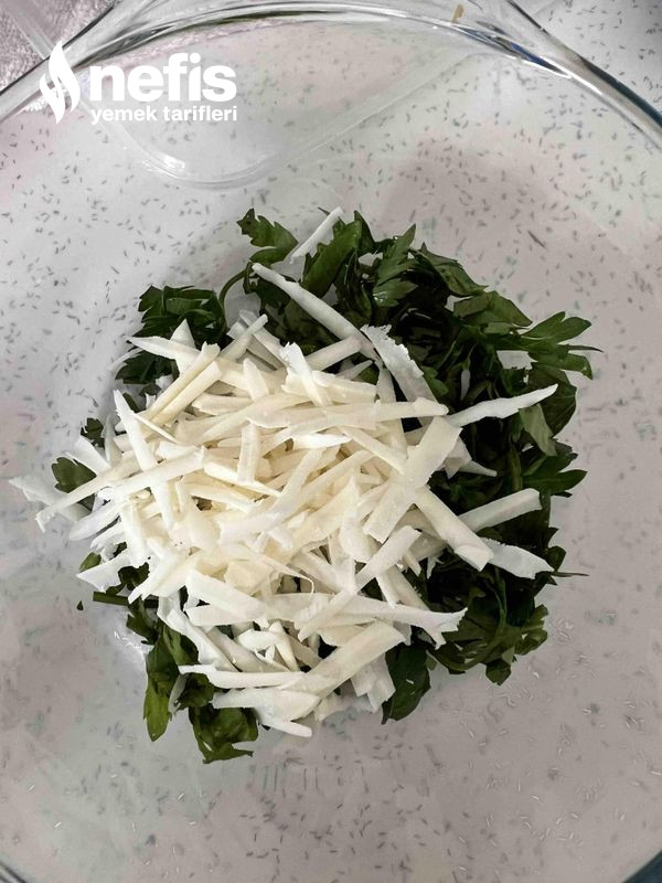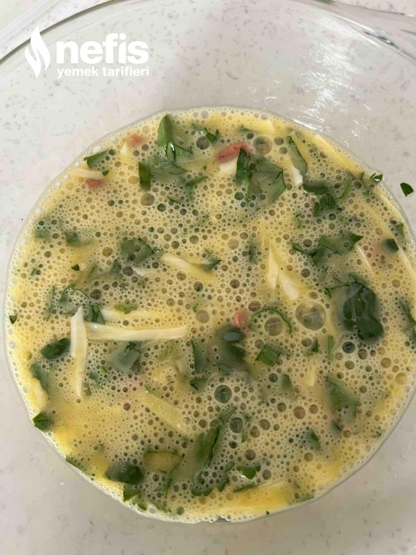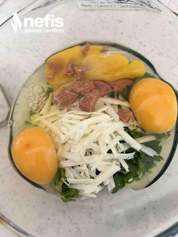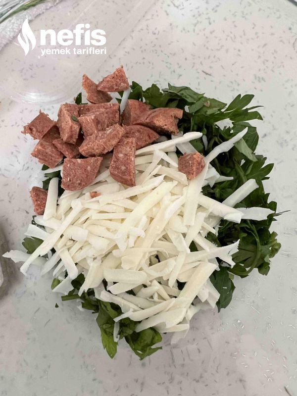- Peyniri rendeleyip içine maydanozu ve sucuğu da da doğrayıp ekleyelim üzerine de yumurta kıralım karıştıralım.