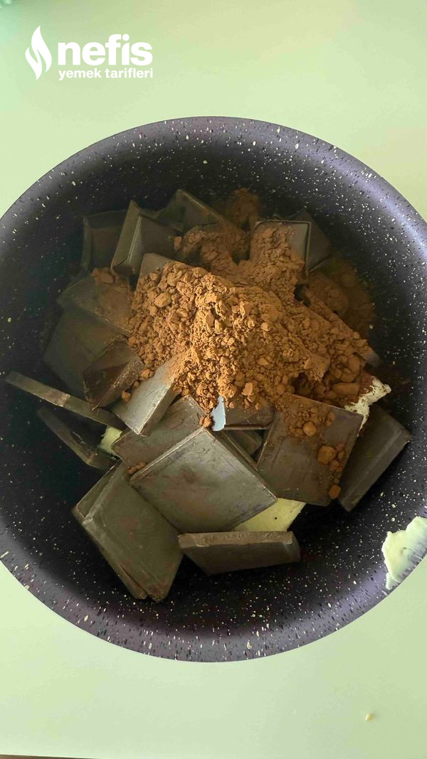 - Küçük bir tencerede tereyağı, bitter çıkolata ve kakao eritip yumurtaya ekleyın, biraz çırpın.