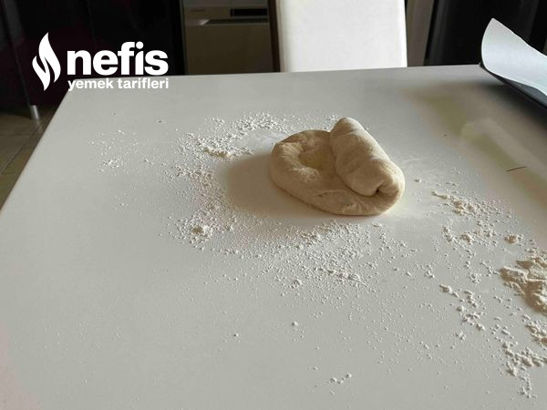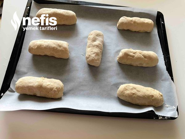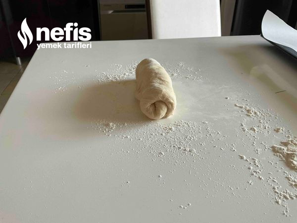 - Mayalanan hamuru 7 eşit kesime bölüp bezeler alın 15 dk daha bu biçimde bekletin ,mayalanan bezeleri parmak uçlarında bastırarak uzunlamasına açın bir ucundan içeri bastırarak rulo biçimi verin tepsiye dizin.
