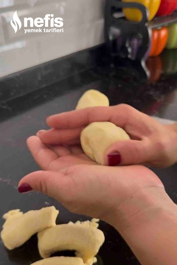 - Bezeyi alıp bir kenarına avuç içinizle bastırıp kaşarı koyun ve öteki tarafına da avuç içinizle bastırın üç kısımları dudak formunda olacak.